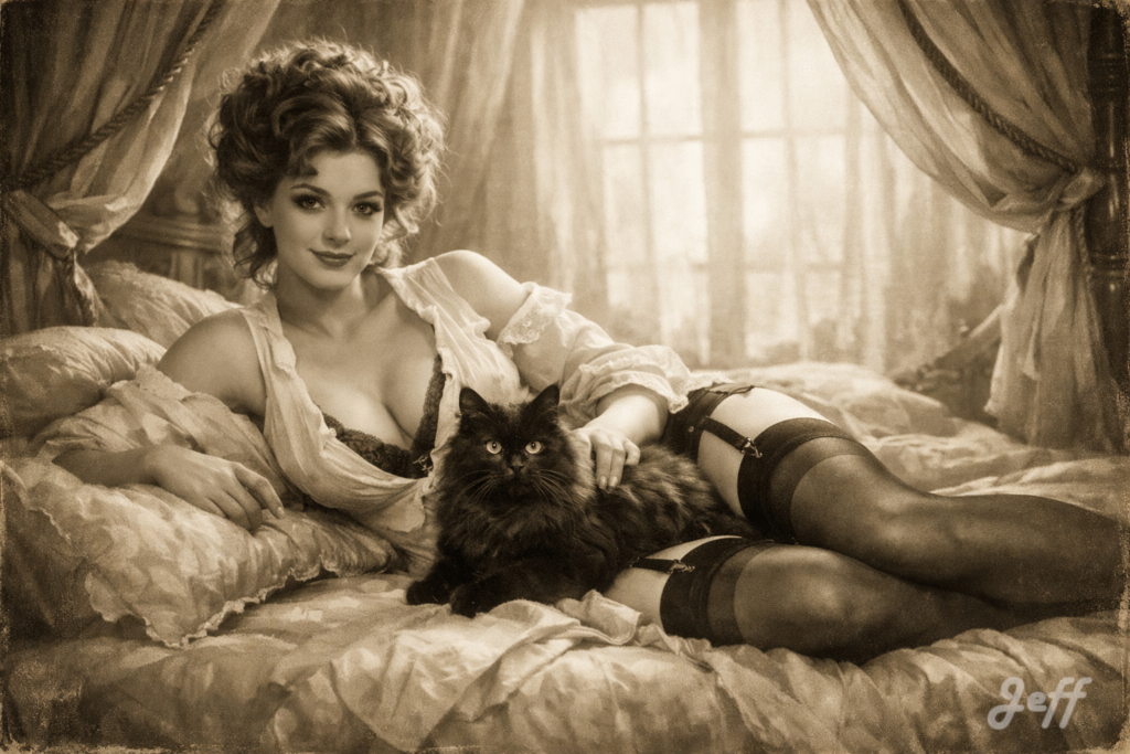aperture : 0; credit : ; camera : ; created_timestamp : 0; copyright : ; contact : ; focal_length : 0; iso : 0; shutter_speed : 0; title : ; caption : Portrait pin-up 1900, Une jeune femme élégante allongée sur une lit a baldaquin, portant une coiffure rousse bouclée, une une blouse blanche avec un décolleté prononcé et ouverte sur des jarretelles et des bas noir, sur ses genoux un chat angora noir. Forte lumière de fenêtre derrière elle (contre-jour). Style de dessin hyperréaliste, illustration numérique, sépia, tonalité monochrome, détails exquis, rendu photo-vintage. ; content : ; orientation : 0; gps : latitude longitude; guid : ;