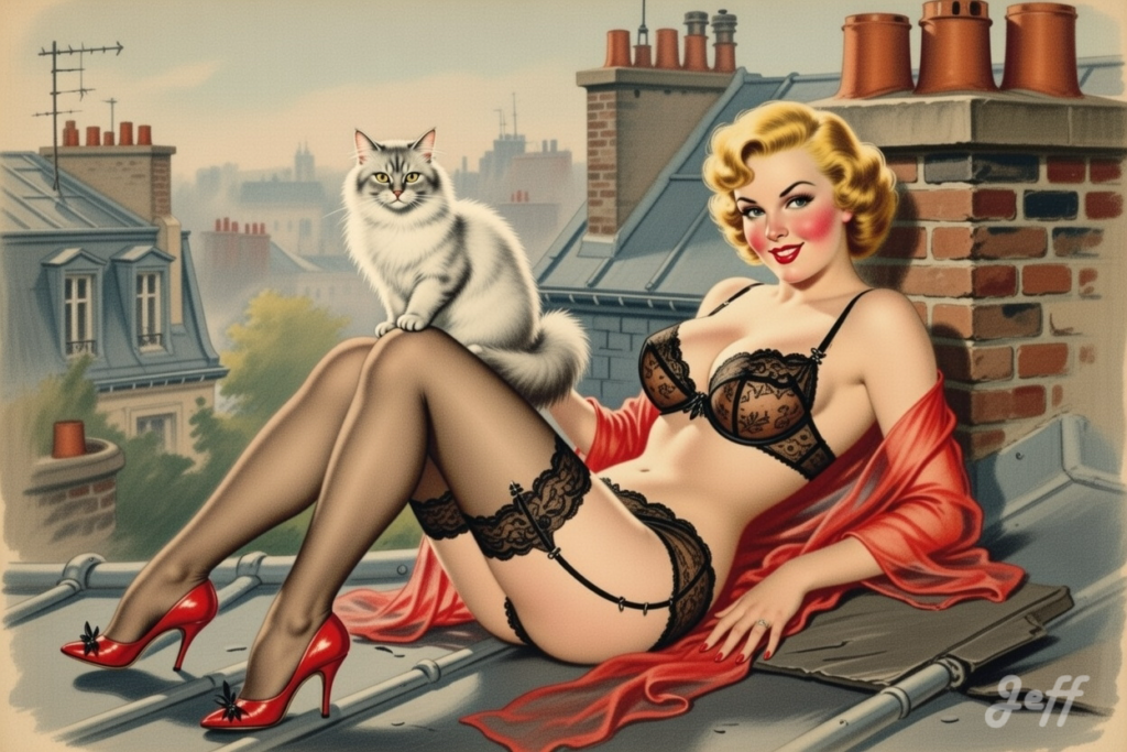 Une illustration pin-up vintage des années 1940, une femme blonde aux cheveux bouclés et courts, allongée sur un toit en ardoise parisien devant une cheminée, vêtue d’une lingerie noire en dentelle et d’une robe rouge transparente. Elle porte des escarpins rouges sur ses genoux un chat angora blanc. L’arrière-plan des toits parisien est doux et flou, avec des tons ardoise et une ambiance brumeuse. Le style est réaliste, sensuel et élégant, inspiré des peintures de Rinaldo Runi. L’éclairage est doux, mettant en valeur les courbes et les détails de la lingerie. L’expression de la femme est coquine et mystérieuse, avec un sourire malicieux et un regard vers le spectateur. format paysage. Aspect ratio 3:2.Une