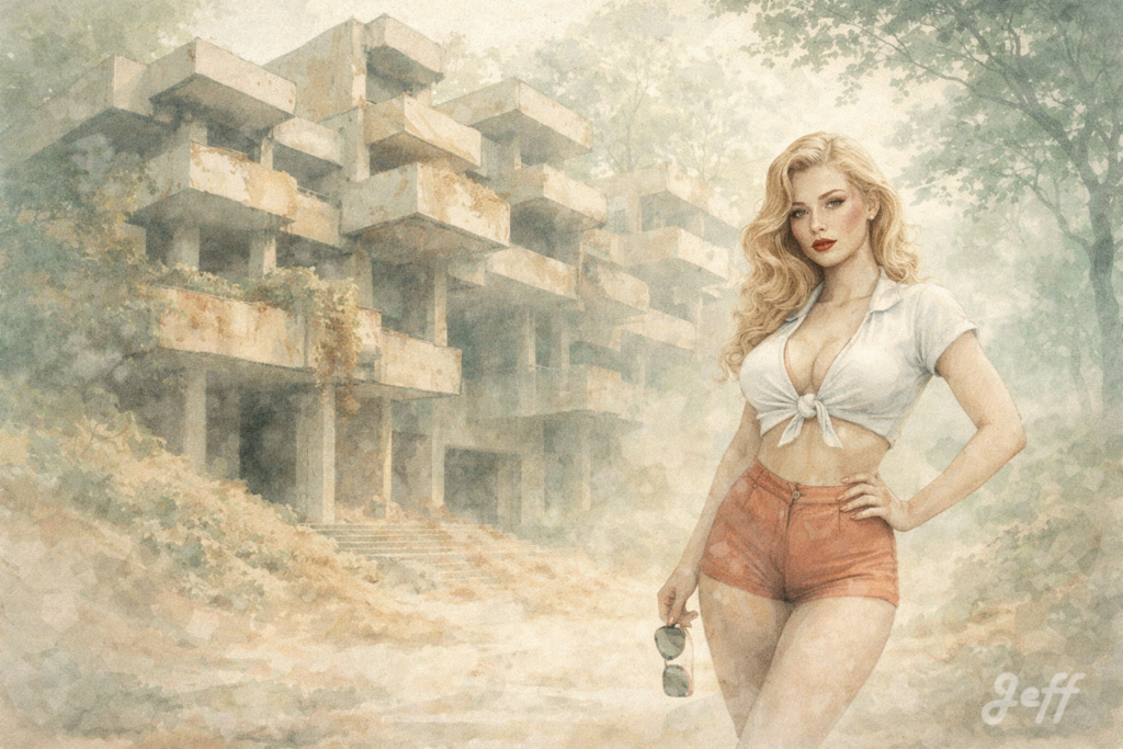 aperture : 0; credit : ; camera : ; created_timestamp : 0; copyright : ; contact : ; focal_length : 0; iso : 0; shutter_speed : 0; title : ; caption : Transform this image with brutalist architecture characterized by its imposing raw concrete structures with geometric cantilevered balconies, now covered in sand and dust. Artistic style: delicate watercolor with blurred and softened outlines, in a palette of pale sage green, misty gray, and muted terracotta. add a modern pin-up in front of a building. Soft, diffused light filters through the canopy, atmospheric perspective, high quality, 3:2 aspect ratio. ; content : ; orientation : 0; gps : latitude longitude; guid : ;