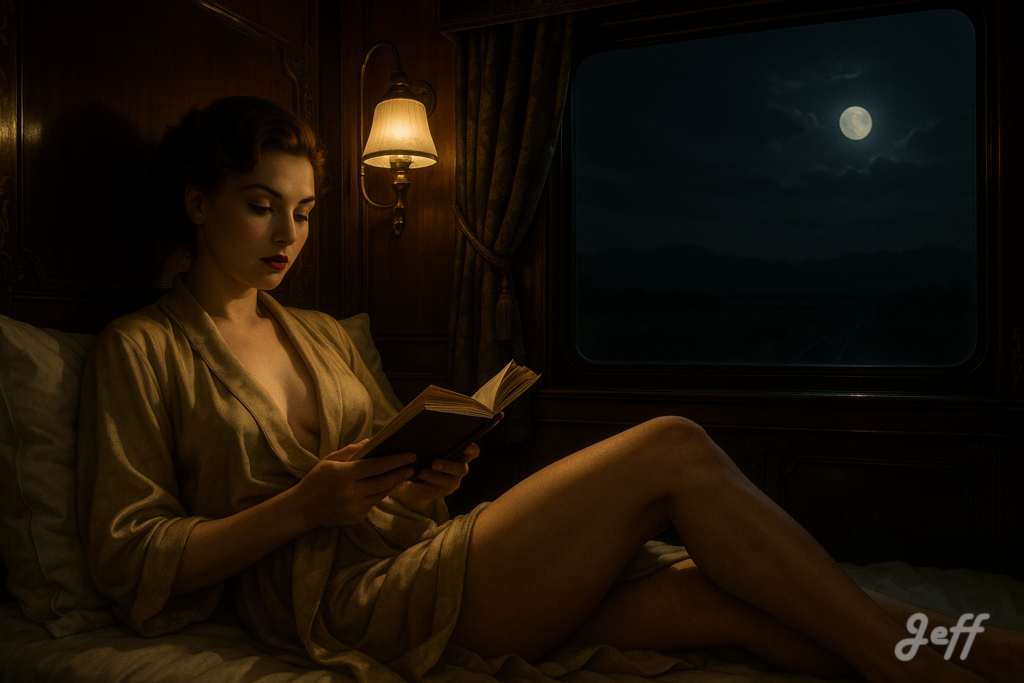 Photo réaliste moderne d’une scène se passant en 1910. Une femme auburn des lèvres rouge vif et un maquillage sophistiqué est allongée sur le lit d’un compartiment de luxe d’un wagon-lits du Transmandchourien. Elle est vêtue d’une robe de chambre beige ouverte et remontée sur ses jambes. La femme est lit un livre. Il fait nuit sur les plaines de chine. Ambiance ténébreuse, orientale mais photoréaliste. L’extérieure a une grande importance pour l’histoire.