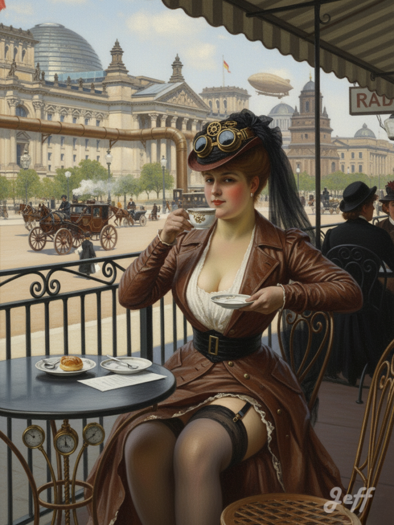 aperture : 0; credit : ; camera : ; created_timestamp : 0; copyright : ; contact : ; focal_length : 0; iso : 0; shutter_speed : 0; title : ; caption : Peinture style Caillebotte et Steampunk, Berlin en 1900, une femme en manteau de cuir et décolletée sur sa poitrine généreuse boit un thé assise en terrasse d’un bar. Elle porte un chapeau à lunettes et une voilette, un porte-jarretelles et des bas. En arrière plan le Palais du Reichstag. format 3:4 ; content : ; orientation : 0; gps : latitude longitude; guid : ;