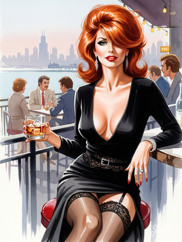 Aquarelle style Aslan, Chicago en 1975, une femme en robe très décolletée sur sa poitrine boit un whisky assise en terrasse d’un bar. Elle porte un porte-jarretelles et des bas. En arrière plan a peine suggéré le lac Michigan format 3:4