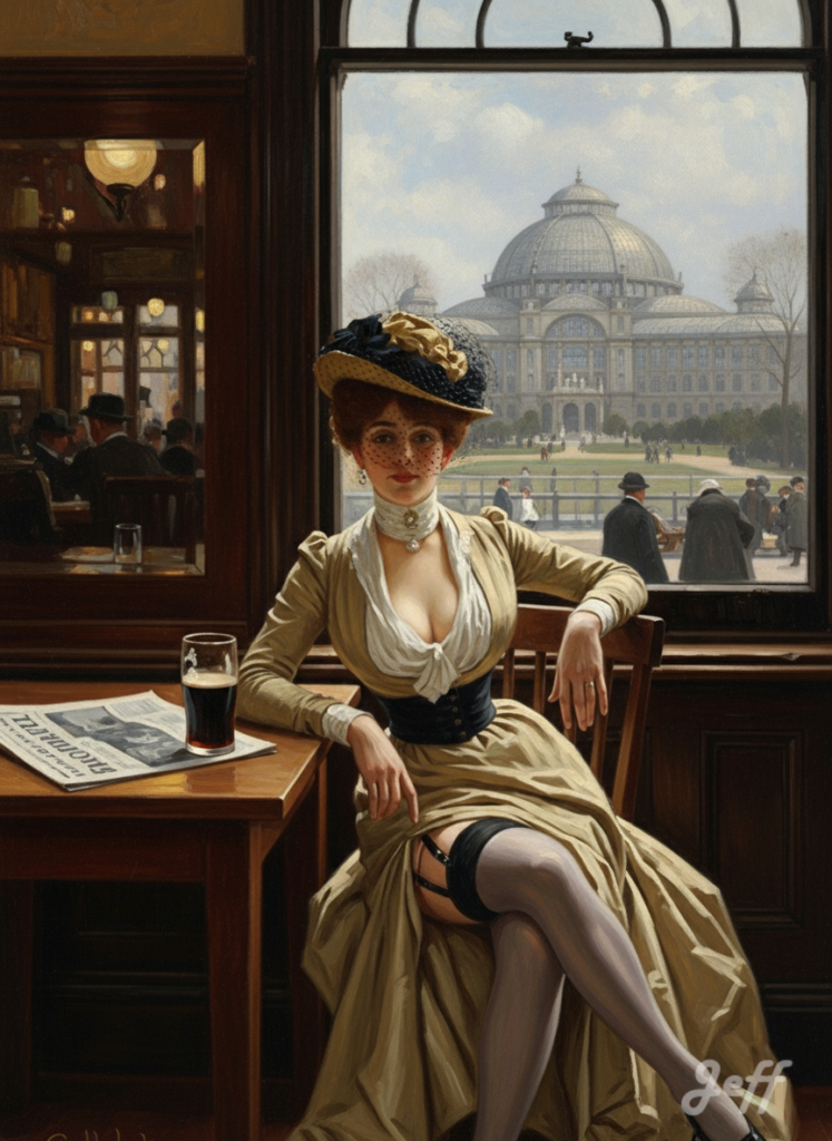 Peinture style Caillebotte, Londres en 1900, une anglaise en robe de voyage décolletée sur sa poitrine généreuse est assise dans un pub. Elle porte un chapeau et une voilette, un porte-jarretelles et des bas. On aperçoit le Crystal Palace par une fenêtre. format 3:4