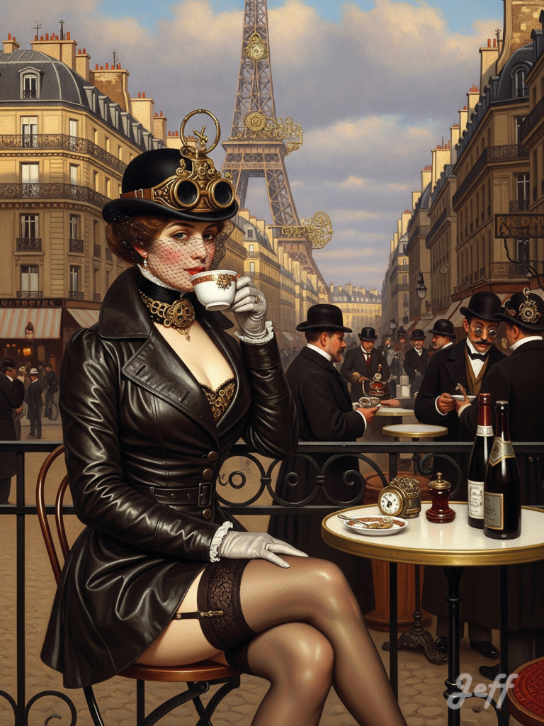 Peinture style Caillebotte et Steampunk, Paris en 1900, une femme en manteau de cuir et décolletée sur sa poitrine généreuse boit un thé assise en terrasse d’un bar. Elle porte un chapeau à lunettes et une voilette, un porte-jarretelles et des bas. En arrière plan au dessus des toits la tour Eiffel. format 3:4