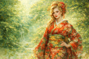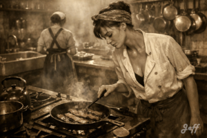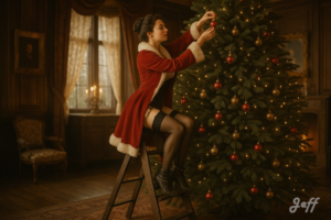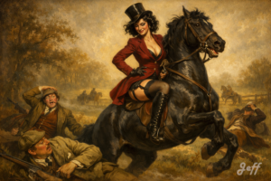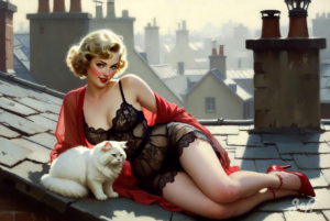 Photo réaliste ambiance 1900. Une femme élancée, une poitrine généreuse, les cheveux blonds coiffés en vagues et porte une blouse les deux boutons du haut ne sont pas boutonnés, des bas fumés noirs et des jarretelles. Elle tient le bas de sa blouse. Elle est surprise le regard baissé vers une petite souris posée sur […]