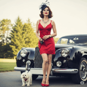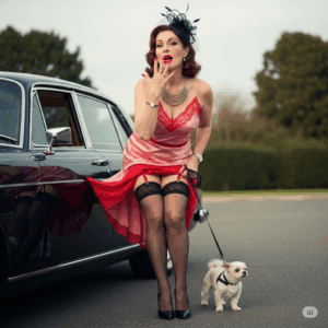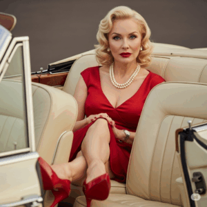 Une femme blonde mature, des seins moyen, avec un maquillage sophistiqué et des lèvres rouges intenses. elles est en partie assise, une jambe repliée sous elle a l’arrière d’une voiture décapotable de luxe elle regarde l’objectif. Elle porte uniquement une veste noire très décolletée. on aperçoit un porte-jarretelle rouge et des bas fumés. A son bras une montre et un elle porte un collier en cuir. Elle porte des Louboutin talon haut, sa culotte est au bout d’un des pied. L’éclairage est doux, mettant en valeur sa peau claire, et l’arrière-plan est champêtre, de couleur beige-brun, créant une ambiance élégante et intemporelle. Le style général rappelle la mode classique ou vintage.