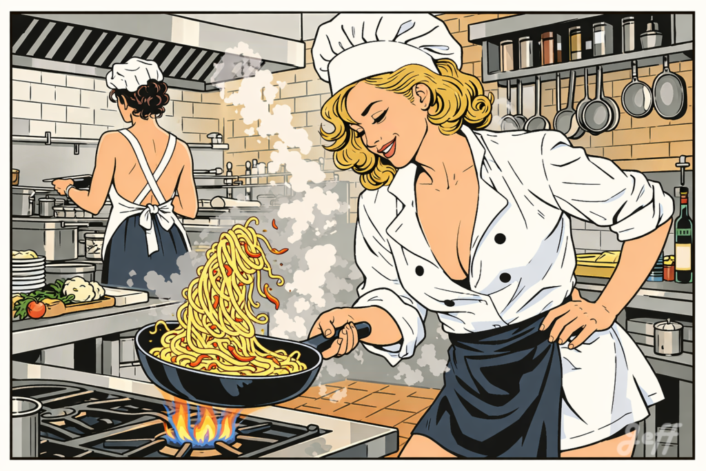 Cuisine et dépendances La cuisine est une de mes autres passions, et j'aime beaucoup mettre les pin-ups en scene autour de la nourriture et de la cuisine. - Une