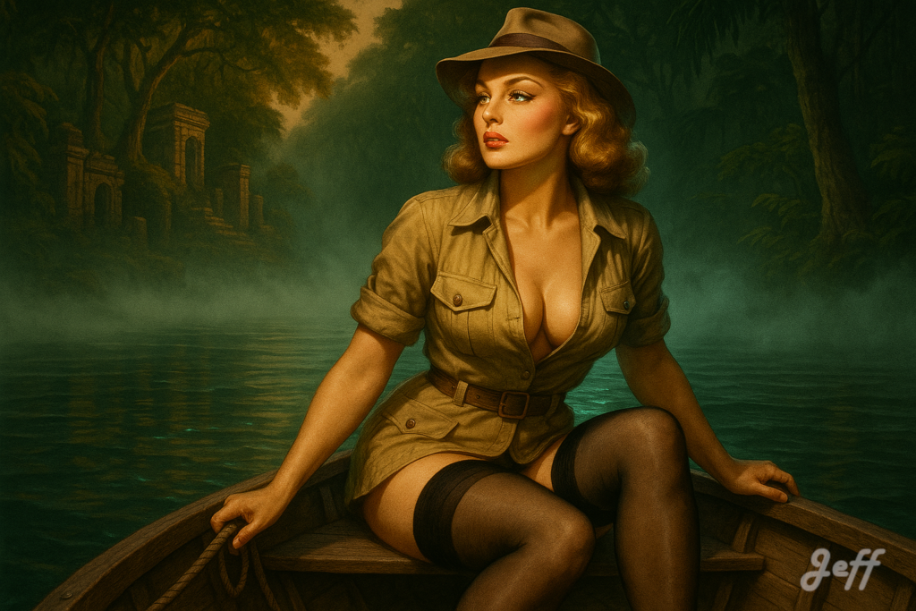 Plan en pied ultra-détaillé et style Alberto Vargas d’une aventurière en 1950, vêtue d’une veste de brousse à col en V qui dévoile sa généreuse poitrine, ses bas noirs, elle est assise dans une barque sur une rivière dans la jungle. des ruines bordent la rive. Son visage est baigné d’une douce lumière émeraude émanant de la rivière. Une brume épaisse flotte sur l’eau, créant un contraste saisissant entre la lueur chaude de la jungle et les reflets émeraudes. Le niveau de détail ultra-réaliste de l’eau et la finesse de la texture de la foret sont remarquables. On ressent une atmosphère de danger.