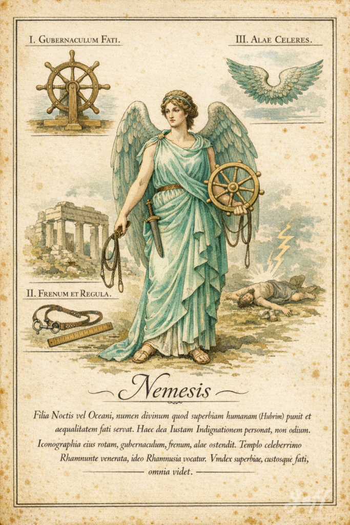 Némésis est une déesse de la mythologie grecque mais aussi un concept : celui de la juste colère (des dieux) et du châtiment céleste. Elle est également la déesse de la vengeance.