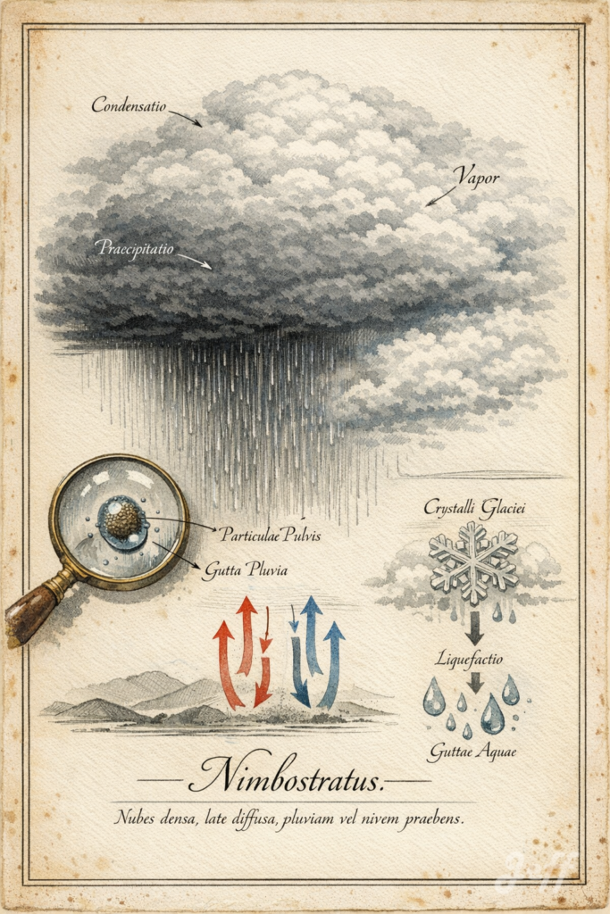 Un nimbostratus (Ns) est un genre de nuage stratiforme d’extension verticale importante, produisant des précipitations faibles à modérées mais sur de grandes superficies.