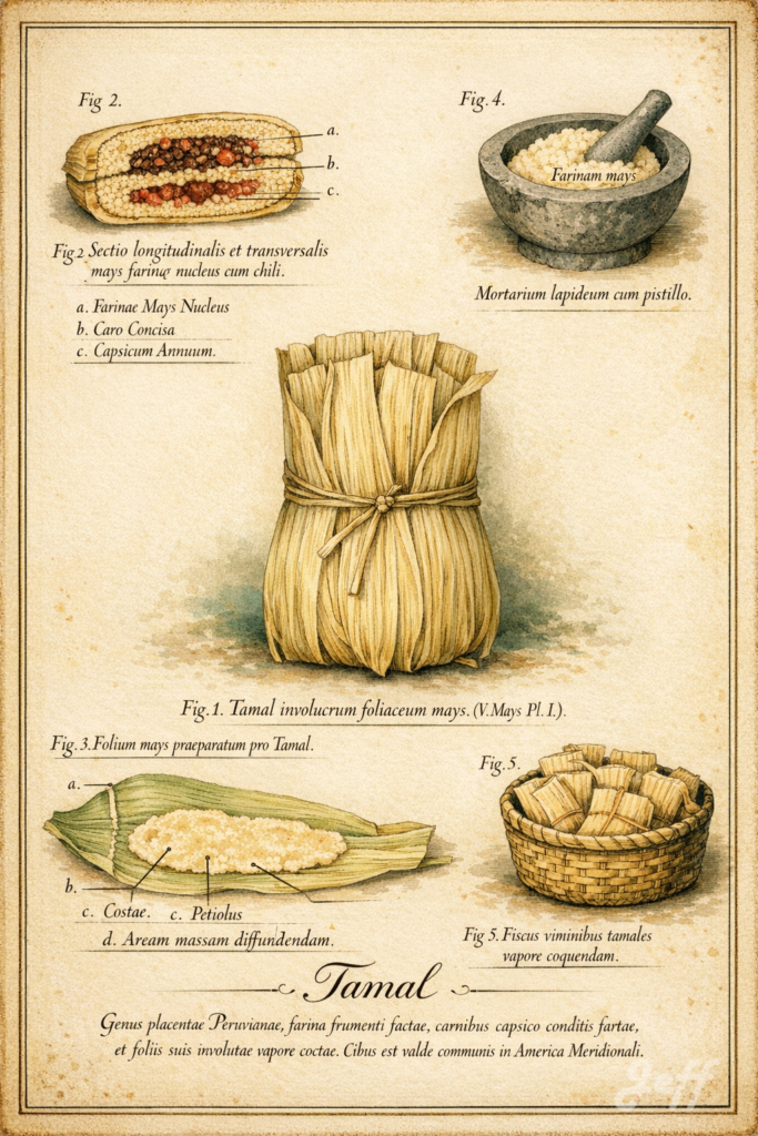 Le tamal est une papillote indigène d’Amérique préhispanique. Il est généralement cuit à la vapeur, enveloppé dans des spathes de maïs, feuilles qui protègent l’épi de la même plante de maïs.