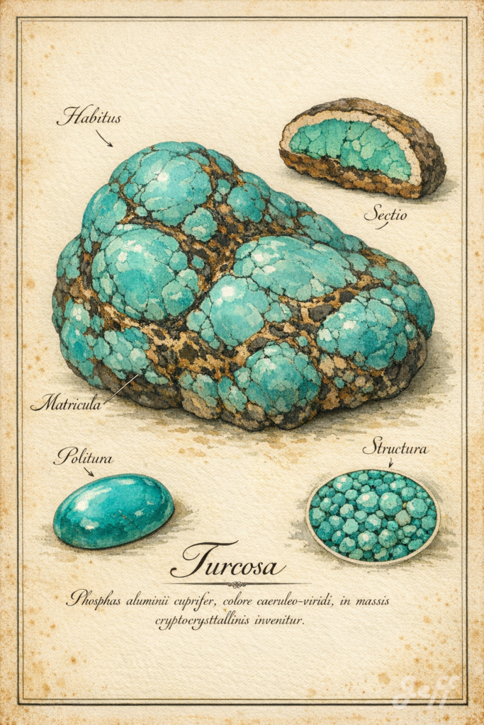 La turquoise est une espèce minérale composée de phosphate hydraté de cuivre et d’aluminium dont la composition chimique est CuAl6(PO4)4(OH)8·4H2O. Elle est rare et, pour ses éléments de meilleure qualité, possède de la valeur.