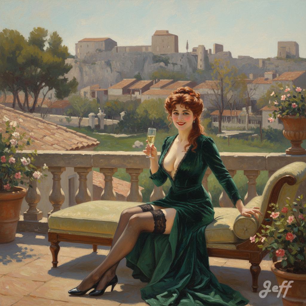 aperture : 0; credit : ; camera : ; created_timestamp : 0; copyright : ; contact : ; focal_length : 0; iso : 0; shutter_speed : 0; title : ; caption : Une peinture à l’huile, genre fantasy romantique, style Caillebotte, avec des textures et des couleurs douces, presque oniriques. Format 1:1 la composition doit occuper tout l’espace. Une femme souriante aux cheveux travaillés portant une robe très décolletée, des bas et des jarretelles, buvant un verre sur une terrasse de toit. L’arrière-plan est l’image fournie : Alleins ; content : ; orientation : 0; gps : latitude longitude; guid : ;