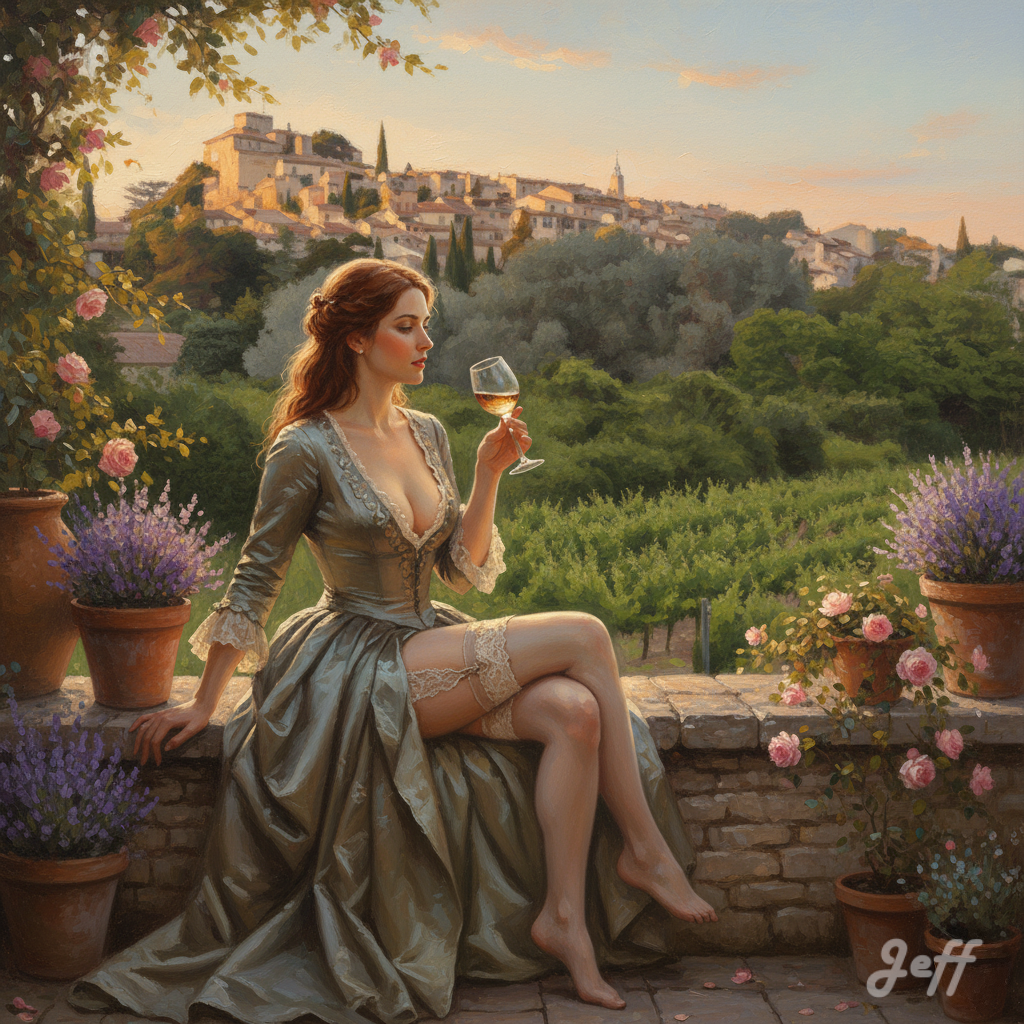 aperture : 0; credit : ; camera : ; created_timestamp : 0; copyright : ; contact : ; focal_length : 0; iso : 0; shutter_speed : 0; title : ; caption : Une peinture à l’huile, style fantasy romantique, avec des textures et des couleurs douces, presque oniriques. Format 1:1 la composition doit occuper tout l’espace. Une femme aux cheveux auburn portant une robe très décolletée, des bas et des jarretelles, buvant un verre sur une terrasse de toit. L’arrière-plan est l’image fournie : Ansouis ; content : ; orientation : 0; gps : latitude longitude; guid : ;