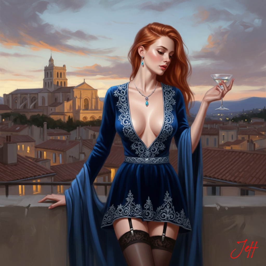 aperture : 0; credit : ; camera : ; created_timestamp : 0; copyright : ; contact : ; focal_length : 0; iso : 0; shutter_speed : 0; title : ; caption : Une peinture à l’huile, style fantasy romantique, avec des textures et des couleurs douces, presque oniriques. une femme aux cheveux auburn portant une robe très décolletée, des bas et des jarretelles, buvant un verre sur une terrasse sur le toit, avec en arrière-plan ; content : ; orientation : 0; gps : latitude longitude; guid : ;