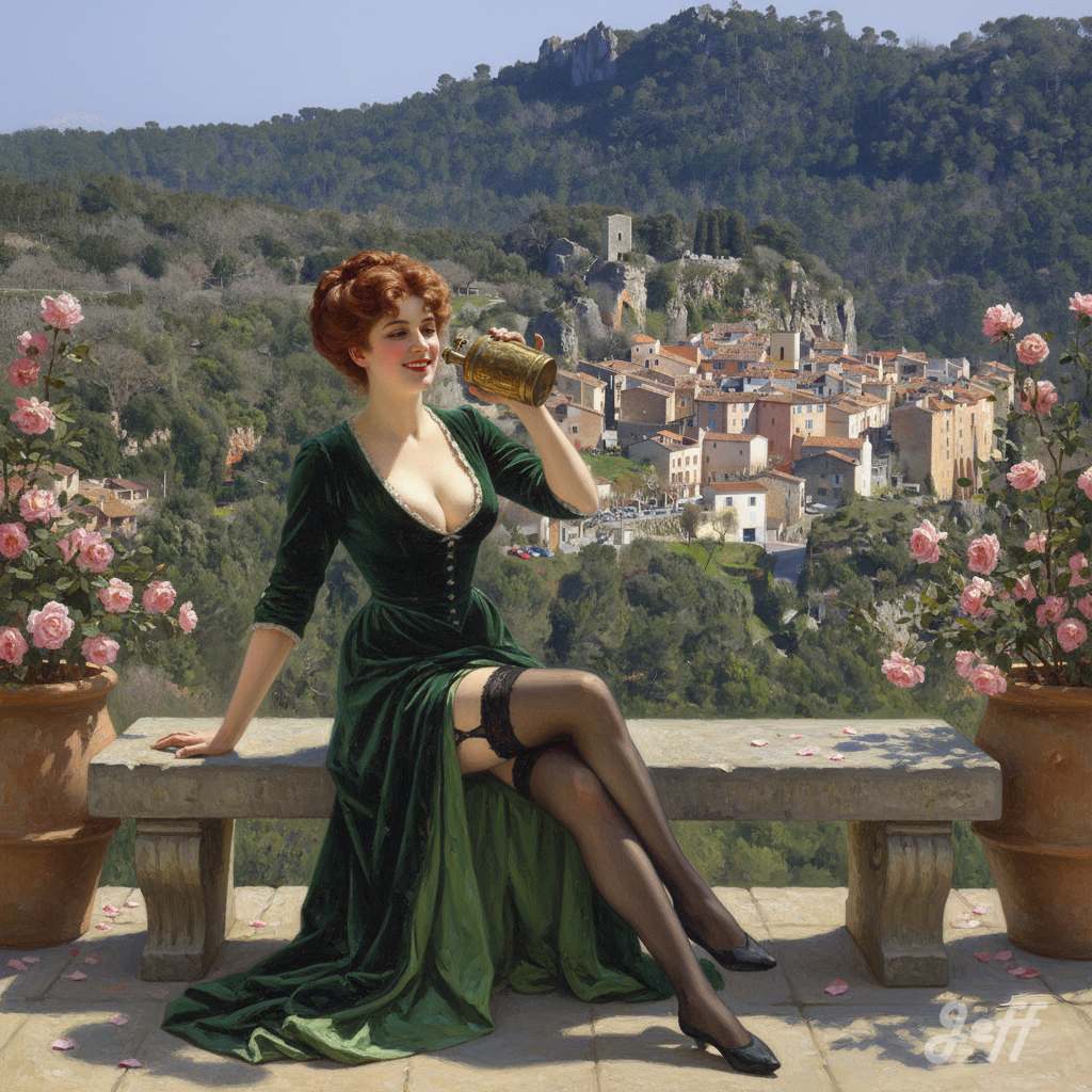 aperture : 0; credit : ; camera : ; created_timestamp : 0; copyright : ; contact : ; focal_length : 0; iso : 0; shutter_speed : 0; title : ; caption : Une peinture à l’huile, genre fantasy romantique, style Caillebotte, avec des textures et des couleurs douces, presque oniriques. Format 1:1 la composition doit occuper tout l’espace. Une femme souriante aux cheveux travaillés portant une robe très décolletée, des bas et des jarretelles, Buvant une gourde sur assise sur une pierre. L’arrière-plan est l’image fournie : Châteaudouble ; content : ; orientation : 0; gps : latitude longitude; guid : ;