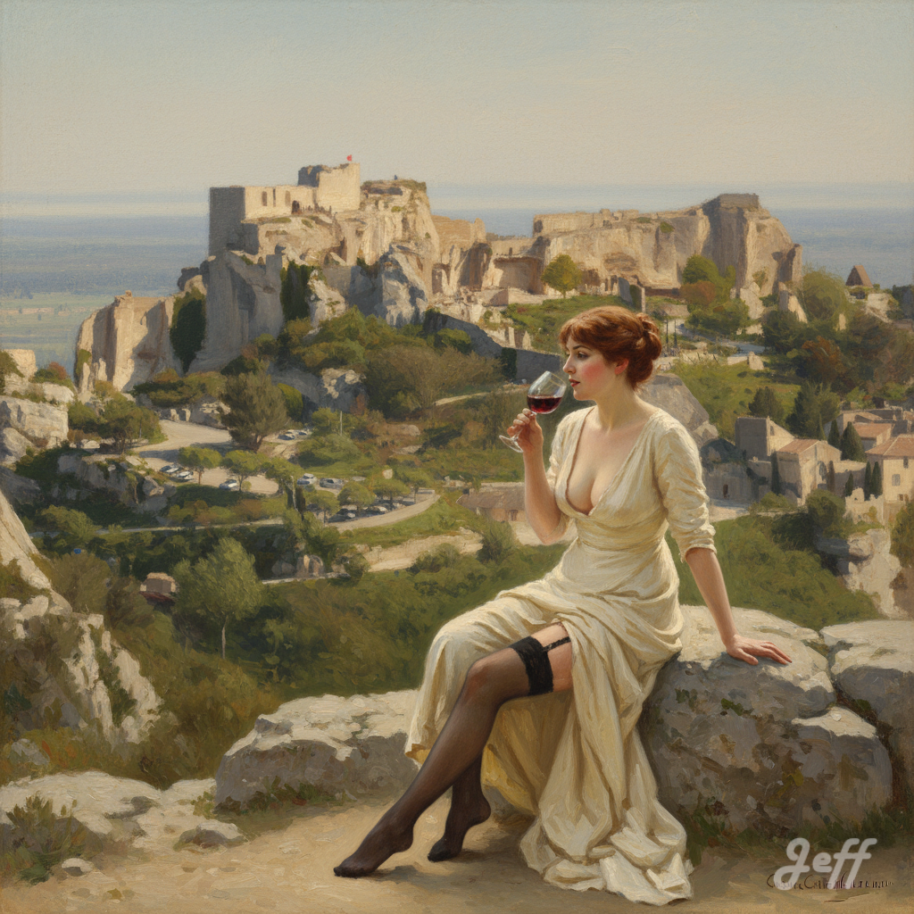 aperture : 0; credit : ; camera : ; created_timestamp : 0; copyright : ; contact : ; focal_length : 0; iso : 0; shutter_speed : 0; title : ; caption : Une peinture à l’huile genre caillebotte, style fantasy romantique, avec des textures et des couleurs douces, presque oniriques. Format 1:1 la composition doit occuper tout l’espace. Une femme aux cheveux auburn portant une robe très décolletée, des bas et des jarretelles, boit un verre assise sur une pierre. L’arrière-plan est l’image fournie : Château des Baux-de-Provence ; content : ; orientation : 0; gps : latitude longitude; guid : ;