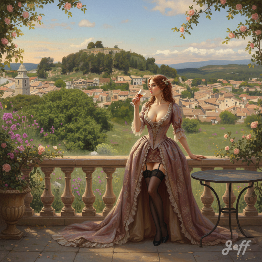 aperture : 0; credit : ; camera : ; created_timestamp : 0; copyright : ; contact : ; focal_length : 0; iso : 0; shutter_speed : 0; title : ; caption : Une peinture à l’huile, style fantasy romantique, avec des textures et des couleurs douces, presque oniriques. Format 1:1 la composition doit occuper tout l’espace. Une femme aux cheveux auburn portant une robe très décolletée, des bas et des jarretelles, buvant un verre sur une terrasse de toit. L’arrière-plan est l’image fournie : le village médiéval de Rognes. ; content : ; orientation : 0; gps : latitude longitude; guid : ;