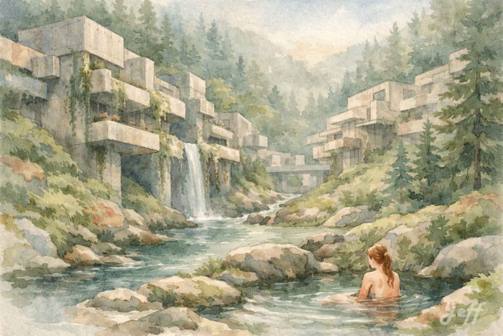 A village in a steep-sided valley, with brutalist architecture, nestled in the heart of a pine and fir forest, is characterized by its imposing raw concrete structures with cantilevered geometric balconies, overgrown with moss and vines. A river meanders from a spring between the monolithic buildings. A woman bathes in a secluded pool. Artistic style: delicate watercolor with blurred and softened outlines, in a palette of pale sage green, misty gray, and muted terracotta. Soft, diffused light filters through the canopy, atmospheric perspective, high quality, 3:2 aspect ratio.