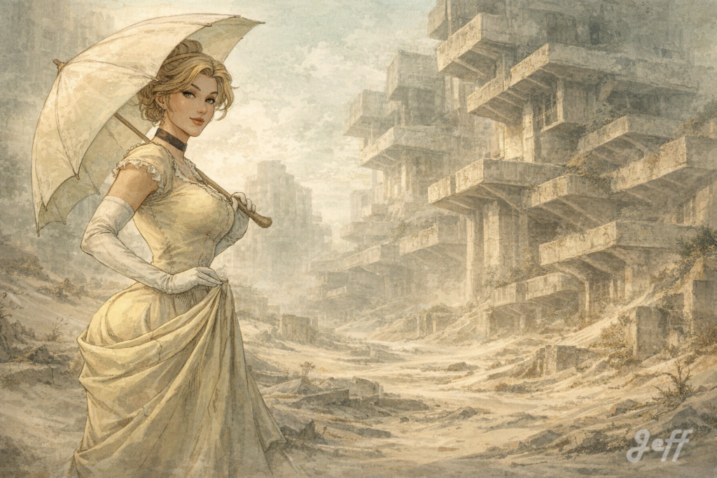 Transform this image change the woman face and with brutalist architecture characterized by its imposing raw concrete structures with geometric cantilevered balconies, now covered in sand and dust. Artistic style: delicate watercolor with blurred and softened outlines, in a palette of pale sage green, misty gray, and muted terracotta. Soft, diffused light filters through the canopy, atmospheric perspective, high quality, 3:2 aspect ratio.