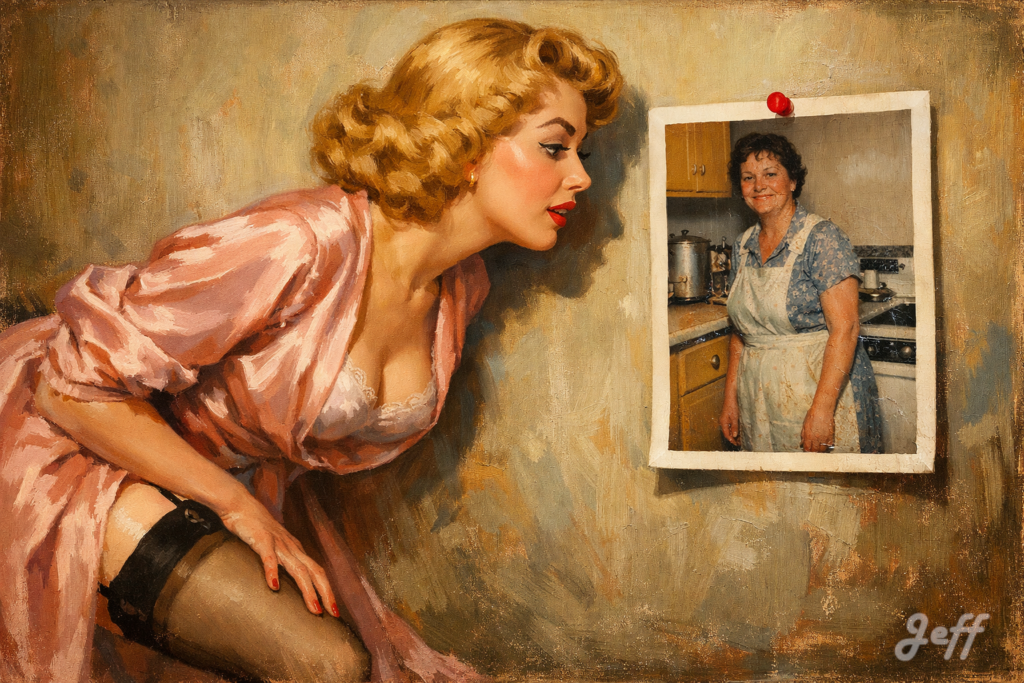 Une huile sur toile vintage dans le style si particulier de Gil Elvgren. Une pin-up glamour des années 1950, aux cheveux blonds bouclés, vêtue d’une robe de chambre en soie et de bas, se penche en avant avec une expression curieuse, observant attentivement une photographie punaisée sur un mur peint. La photographie elle-même n’est pas une peinture, mais une reproduction hyperréaliste d’un tirage Ektachrome vintage des années 1950, montrant une femme simple, ordinaire, en robe de chambre et tablier, souriant d’un air fatigué dans une cuisine banale. Le contraste entre la pin-up picturale et la photographie argentique réaliste et granuleuse est saisissant. Couleurs riches, coups de pinceau visibles sur le sujet principal.