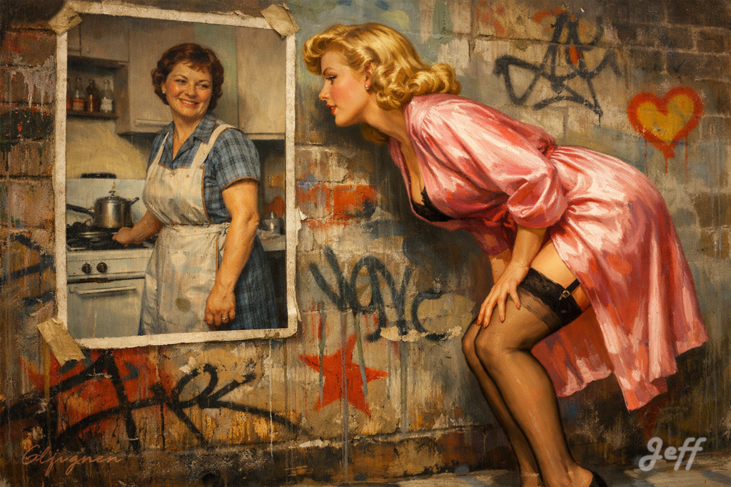 Une huile sur toile vintage dans le style si particulier de Gil Elvgren. Une pin-up glamour des années 1950, aux cheveux blonds bouclés, vêtue d’une robe de chambre en soie et de bas, se penche en avant avec une expression curieuse, observant attentivement une photographie sur un mur « Street Art » dans une rue. La photographie elle-même n’est pas une peinture, mais une reproduction hyperréaliste d’un tirage Ektachrome vintage des années 1950, montrant une femme simple, ordinaire, en robe de chambre et tablier, souriant d’un air fatigué dans une cuisine banale. Le contraste entre la pin-up picturale et la photographie argentique réaliste et granuleuse est saisissant. Couleurs riches, coups de pinceau visibles sur le sujet principal.