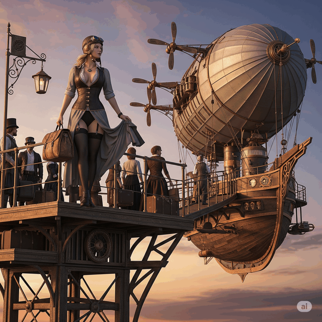 image photoréaliste d’un ballon dirigeable steampunk. Une femme steampunk en haut d’une tour d’embarquement, regarde le dirigeable. Elle porte une robe de voyage a bouton mastique très décolletée sur sa poitrine généreuse, ouverte sur son porte-jarretelles et ses bas noirs. Elle a un sac de cuir a la main et tiens sa robe de l’autre. Elle est blonde et porte un casque en cuir a lunette. quelques personnes attendent pour embarquer.