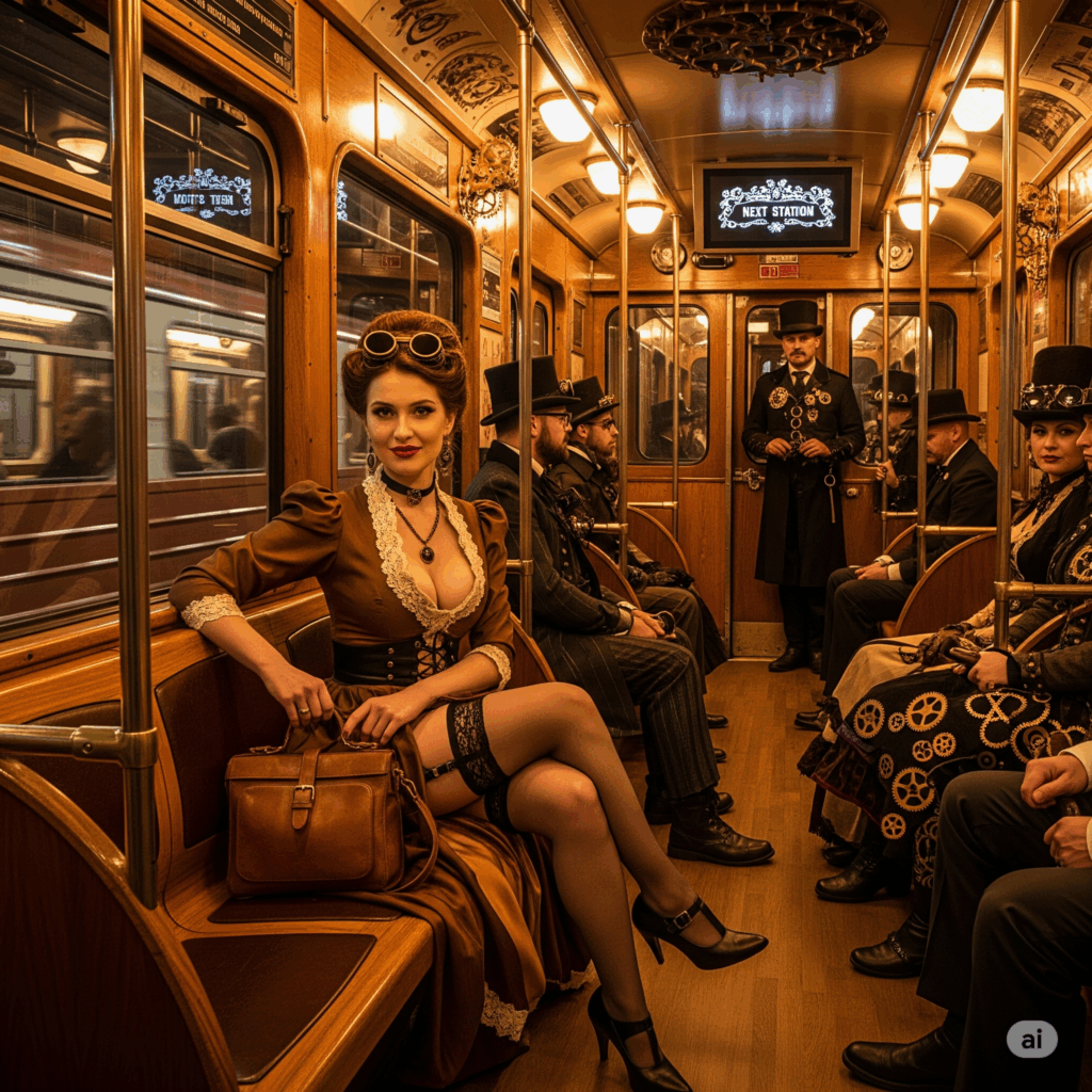 Une photo Ambiance victorienne Steampunk. Un wagon de métro Steampunk en bois et cuivre, les sièges sont le long des parois , un petit écran annonce la station suivante. Une femme victorienne Steampunk est assise contre la vitre, auburn des lèvres rouge vif et un maquillage sophistiqué, vêtue d’une robe mastique, un sac en cuir dans la main gauche, la robe retroussé et les jambes croisées, sur ses bas fumés et ses jarretelles noires, sa robe Steampunk est très ouverte décolletée, des chaussures noires, des lunettes steampunk. La femme baisse un peu la tête en souriant. Quelques hommes victoriens en haut de forme et lunettes Steampunk et femmes victorienne Steampunk sont assis et debout. On aperçoit un wagon en bois et cuivre en sens inverse par une vitre a gauche. Ambiance victorienne Steampunk, glamour, photoréaliste.