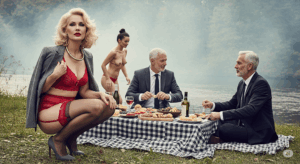 Une femme et deux hommes déjeune assis sur l’herbe autour d’une nappe à carreau et de victuailles. La femme est une blonde mature clair de peau au rouge à lèvres intense. Elle est accroupie en escarpins vers l’objectif, une veste grise sur les épaules, de la lingerie minimaliste en dentelle rouge, porte-jarretelles rouge, et bas fumés. Elle porte un collier en cuir épais. les deux hommes sont plus âgés vêtus de costumes modernes sans cravate. Ils sont décontractés et regarde la femme en mangeant. Un peu en arrière une femme brune en chignon à peine habillée sort de l’eau en direction du trio. Ambiance brumeuse et vaporeuse dans un paysage boisé en bord de rivière. Les personnages sont sophistiqués, glamour et vintage l’image est au format paysage.