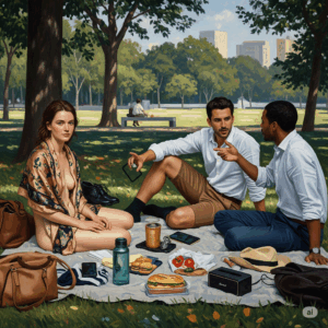 Prompt Gemini: Une photo sur le principe du déjeuner sur l’herbe d’Édouard Manet avec des personnage moderne.