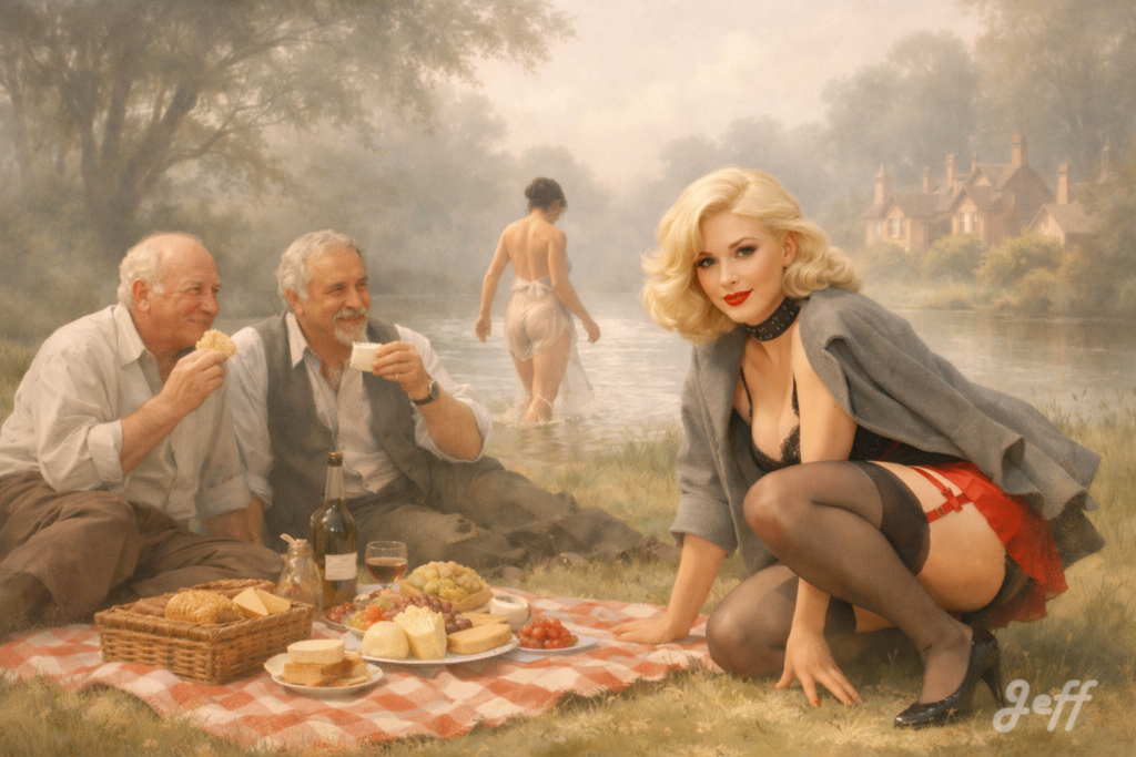 Une illustration d’une banlieue anglaise victorienne paisible des années 1850. Une femme et deux hommes déjeune assis sur l’herbe autour d’une nappe à carreau et de victuailles. La femme est une blonde mature clair de peau au rouge à lèvres intense. Elle est accroupie en escarpins vers l’objectif, une veste grise sur les épaules, jarretelles rouge, et bas fumés. Elle porte un collier en cuir épais. les deux hommes sont plus âgés vêtus de pantalons de costumes et chemises sans cravate. Ils sont décontractés et regarde la femme en mangeant. Un peu en arrière une femme brune en chignon à peine habillée sort de l’eau en direction du trio. Ambiance brumeuse et vaporeuse dans un paysage boisé en bord de rivière. Les personnages sont sophistiqués, glamour et vintage l’image est au format paysage. Style artistique : aérographe aux contours flous et adoucis, dans une palette de auburn pâle, de brume et de vert. Une lumière douce et diffuse filtre dans une brume légère, perspective atmosphérique, haute qualité.