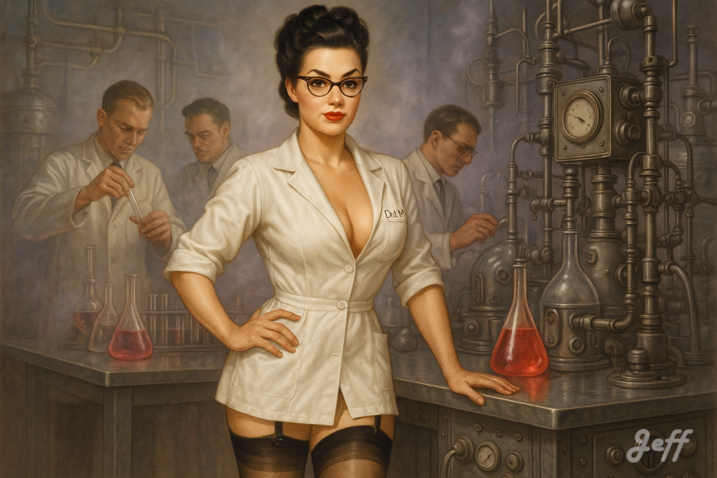 Des tubes sinueux parcourent les murs, transportant des fluides mystérieux d’une station à l’autre, créant un réseau complexe et fascinant. Des écrans holographiques affichent des formules complexes et des schémas moléculaires en 3D, ajoutant à l’ambiance futuriste du lieu. L’air est imprégné d’une légère odeur métallique et d’un parfum indéfinissable, mélange de produits chimiques et de quelque chose d’étrangement enivrant.