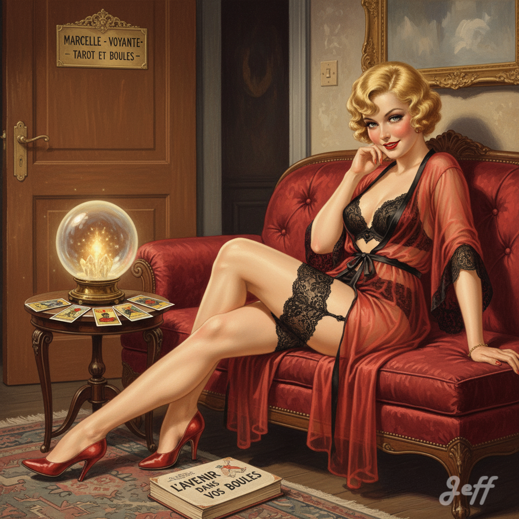 aperture : 0; credit : ; camera : ; created_timestamp : 0; copyright : ; contact : ; focal_length : 0; iso : 0; shutter_speed : 0; title : ; caption : Une illustration pin-up vintage des années 1925. Une voyante blonde aux cheveux bouclés et courts, assise sur un canapé rouge, vêtue d’une lingerie noire en dentelle et d’une robe rouge transparente. Elle porte des escarpins rouges. Sur une table une boule de cristal et des cartes de Tarot. A terre un livre « L’avenir dans vos boules ». Sur une porte ouverte en arrière plan une plaque « Marcelle – Voyante – Tarot et Boules ». Le style est réaliste, sensuel et élégant, inspiré des peintures de Rinaldo Runi. L’éclairage est doux, mettant en valeur les courbes et les détails de la lingerie. L’expression de la femme est coquine et mystérieuse, avec un sourire malicieux et un regard vers le spectateur. ; content : ; orientation : 0; gps : latitude longitude; guid : ;