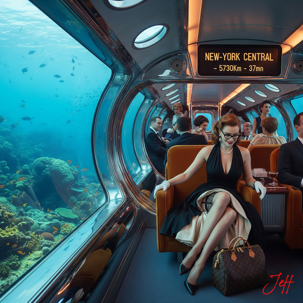 Une photo Ambiance retrofuture googie 1950. Un véhicule retrofuture googie 1950 avec des hublots circule vite dans une tube transparent au fond de la mer, un écran annonce « New-york Central – 5730Km – 37mn » . Une femme est assise dans un fauteuil individuel confortable, auburn des lèvres rouge vif et un maquillage sophistiqué, vêtue d’une robe 1950, un sac Vuitton a ses pied, la robe retroussé et les jambes croisées, sur ses bas fumés et ses jarretelles noires, sa robe est très ouverte décolletée, des chaussures noires, des lunettes. La femme baisse un peu la tête en souriant. Quelques hommes et femme 1950 sont assis dans des fauteuil individuel confortables ou debout. On aperçoit le fond de la mer par une vitre a gauche. Ambiance glamour, photoréaliste.