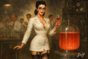 Dans les profondeurs d’un complexe souterrain, se cache un laboratoire secret, baigné d’une lumière tamisée et colorée. Des fioles et des béchers de toutes tailles, remplis de liquides fluorescents aux teintes vibrantes – bleus électriques, verts émeraude, rouges rubis et violets hypnotiques – bouillonnent doucement sur des paillasses en acier inoxydable.