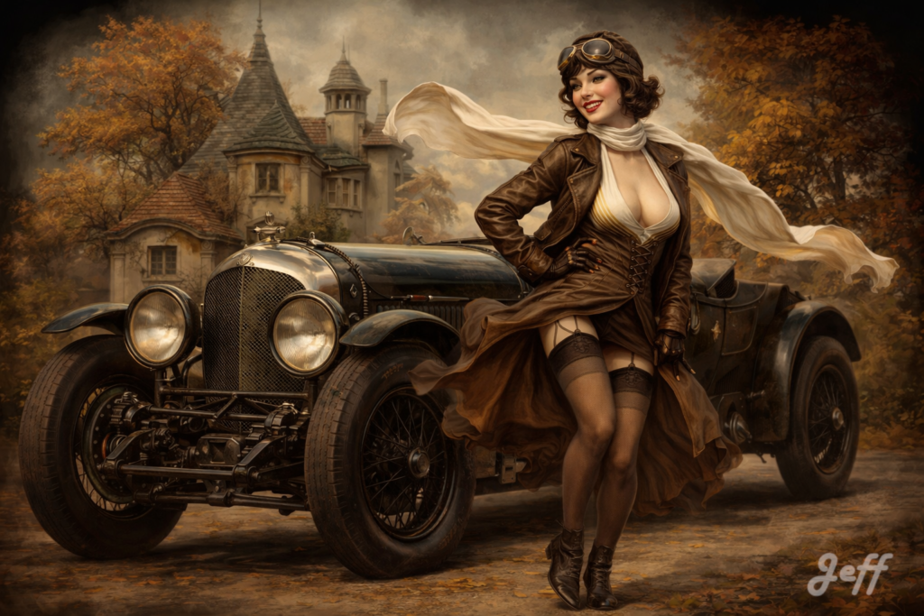 (1929 Bentley 6½ Litre) En 1929. Une Photo de la Bentley 6½ Litre est fourni. Une femme souriante pose devant la Bentley 6½ Litre, des lèvres rouge vif et un maquillage sophistiqué, vêtue d’une robe de voyage, d’un casque et d’un blouson en cuir, un foulard, les jupes retroussés par le vent sur ses bas fumés et ses jarretelles noires, son corsage est très ouvert sur sa poitrine, des bottines basse noires. La femme tourne un peu la tête en souriant. En arrière plan le podium et les tribunes. Style artistique : aquarelle délicate aux contours flous et adoucis, dans. Une lumière douce et diffuse filtre à travers la brume, perspective atmosphérique, haute qualité. Ambiance, couleurs et style de la seconde image.