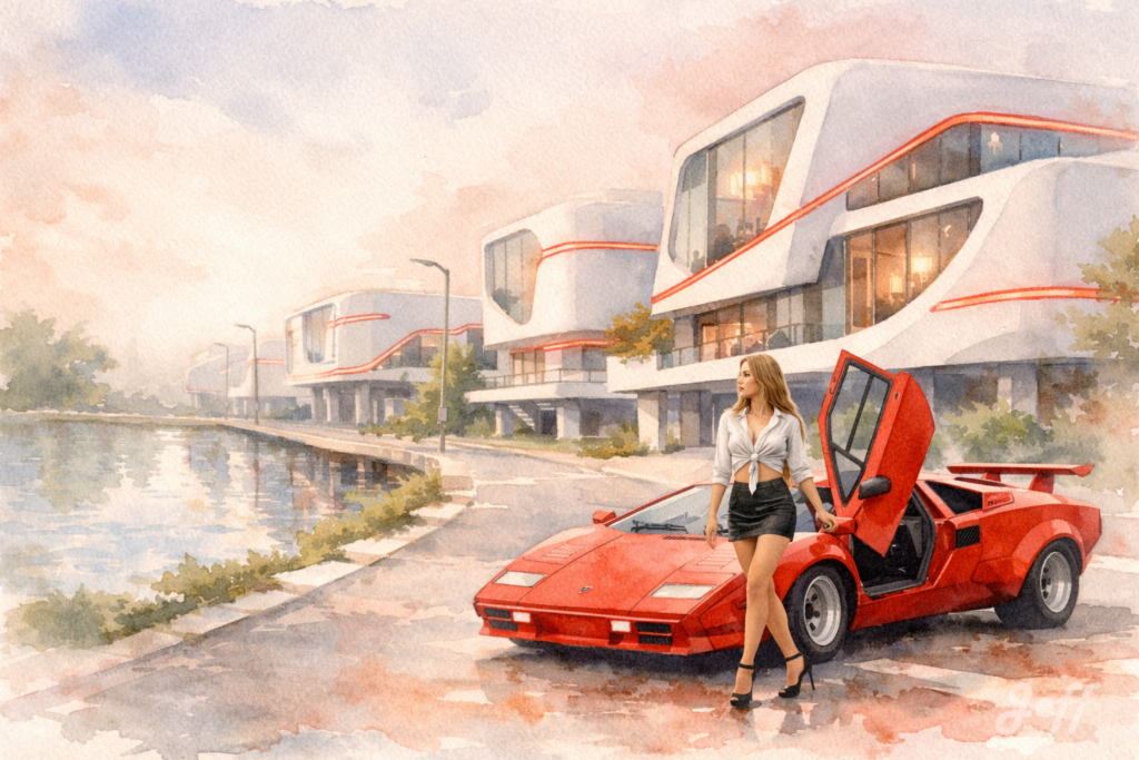 aperture : 0; credit : ; camera : ; created_timestamp : 0; copyright : ; contact : ; focal_length : 0; iso : 0; shutter_speed : 0; title : ; caption : Vue grand angle d’une rue de banlieue futuriste bordée de maisons modulaires néo-futuristes et organique. L’architecture se caractérise par des façades blanches élégantes en composite, des angles arrondis et de grandes baies vitrées asymétriques. De subtils rubans LED rouge intégrés soulignent les structures. Le design est minimaliste et high-tech, évoquant des modules d’habitation modernes. Un lac a gauche des maisons sur pilotis. Une femme en chemisier blanc noué et mini jupe cuir 1974s minimaliste bas et talons sort d’une Lamborghini Countach rouge. Style artistique : aquarelle délicate aux contours flous et adoucis, dans une palette de rouge neon, de blanc brumeux et de sable. Une lumière douce et diffuse filtre à travers la brume, perspective atmosphérique, haute qualité, format 3:2. ; content : ; orientation : 0; gps : latitude longitude; guid : ;