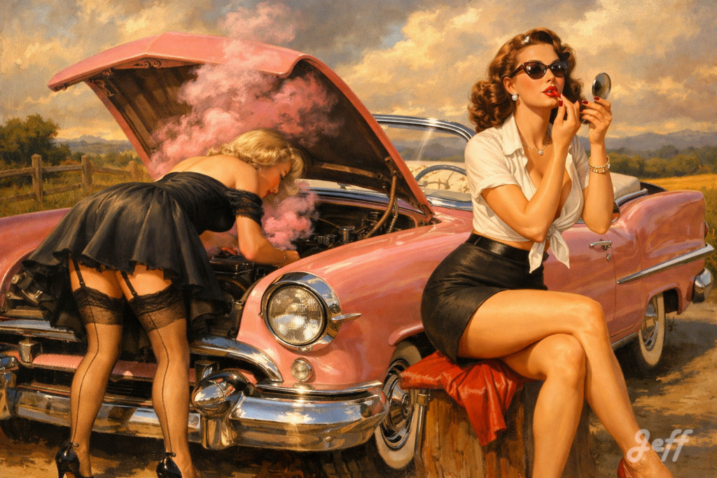 aperture : 0; credit : ; camera : ; created_timestamp : 0; copyright : ; contact : ; focal_length : 0; iso : 0; shutter_speed : 0; title : ; caption : Illustration style alberto vargas des année 40s 50s. Deux pin-up sont en panne sur le bord d’une route de campagne avec une magnifique décapotable rose. L’une, avec ses talons hauts et sa jupe corolle, est penchée sous le capot d’où sort une petite fumée rose, tandis que l’autre utilise le rétroviseur pour remettre son rouge à lèvres, totalement indifférente au moteur, en attendant qu’un beau conducteur passe par là.Lumière dramatique, couleurs douces et chaudes typiques des illustrations vintage. Style de dessin hyperréaliste, illustration numérique, détails exquis, rendu photo-vintage. ; content : ; orientation : 0; gps : latitude longitude; guid : ;
