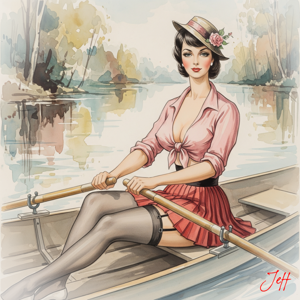 Photo réaliste 1950 style David Hamilton. Une femme élancée, ayant une généreuse poitrine, fait du bateau a rame sur une rivière. Elle est brune un chapeau d’époque, des lunettes de soleil 1950, un chemisier vieux rose noué a la taille, une jupe plissée courte, un porte-jarretelle noir et des bas fumée, des chaussures d’époque plates. la jambe droite est sous elle. Format 1:1.
