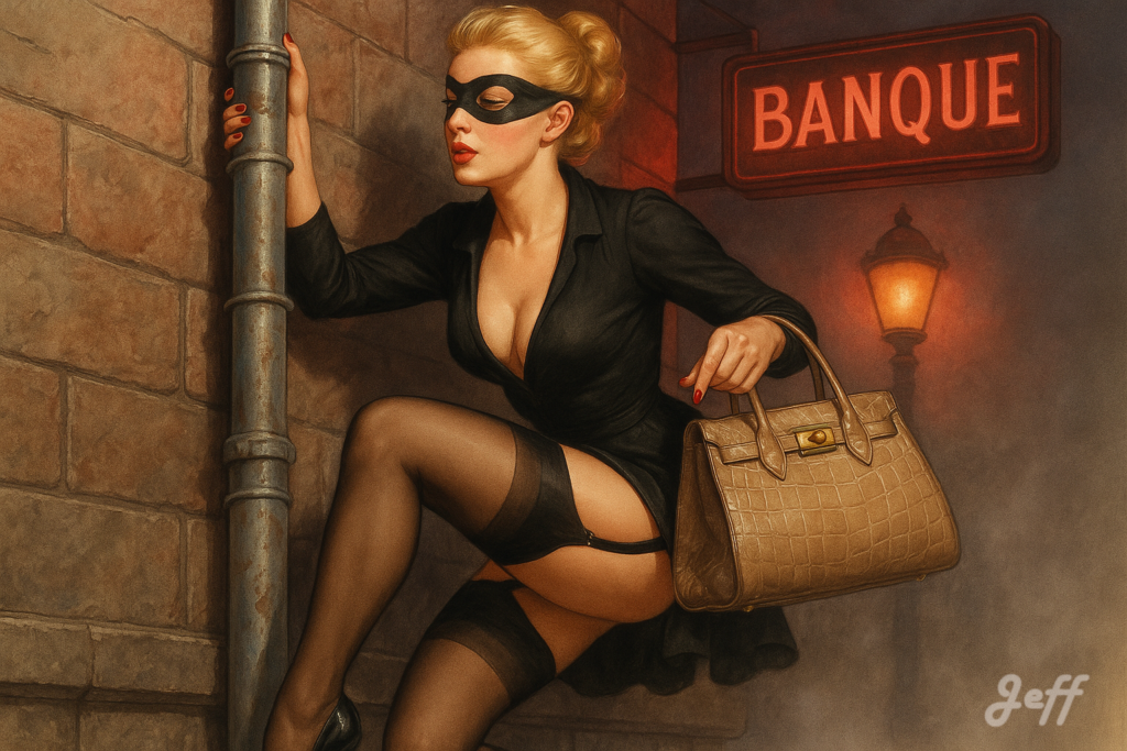 aperture : 0; credit : ; camera : ; created_timestamp : 0; copyright : ; contact : ; focal_length : 0; iso : 0; shutter_speed : 0; title : ; caption : Plan en pied ultra-détaillé et style Alberto Vargas d’une pin-up cambrioleuse en 1950, lèvres rouge vif vêtue d’une blouse noir à col en V qui dévoile sa poitrine, des bas noirs et des talons très haut, un gros sac a main de luxe. Elle porte ses cheveux blonds noués, un masque devant les yeux. Ses ongles sont vernis en rouge vif. Elle essaie de monter discrètement le long d’une gouttière Une fine brume flotte dans l’air, créant un contraste saisissant entre la lueur chaude d’un réverbère et les reflets rouge bordeaux. d’une enseigne « Banque » Le niveau de détail ultra-réaliste de la gouttière et la finesse de la texture du mur et de la pierre sont remarquables. ; content : ; orientation : 0; gps : latitude longitude; guid : ;