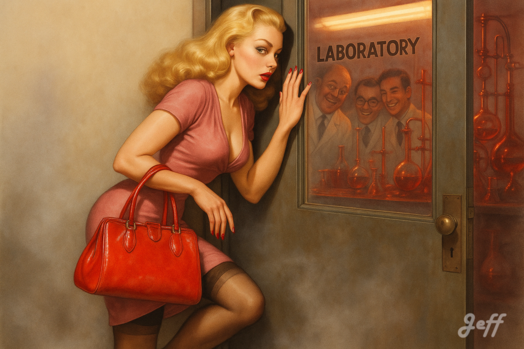 Plan en pied ultra-détaillé et style Alberto Vargas d’une pin-up espionne en 1950, lèvres rouge vif vêtue d’une robe rose a col en V qui dévoile sa poitrine, des bas noirs et des talons très haut, un gros sac a main de luxe rouge fluo. Elle porte des cheveux blonds très long en vague. Ses ongles sont vernis en rouge vif. Elle essaie de regarder discrètement par la porte vitrée d’un laboratoire. Toutes les personnes dans la pièces regarde rigolards la femme prise au piège. Une fine brume flotte dans l’air, créant un contraste saisissant entre la lueur chaude des tubes fluorescent du couloir et les reflets rouge bordeaux des instrument du laboratoire. Le niveau de détail ultra-réaliste de la porte vitrée et le flou du laboratoire sont remarquables.
