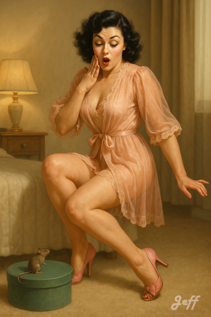 Illustration vintage de style pin-up représentant une femme glamour surprise, vêtue d’une robe et de talons roses, se tenant sur une jambe, le regard baissé vers une petite souris posée sur une boîte à chapeau verte, dans une chambre à coucher. Ses cheveux noirs et bouclés contrastent avec son expression de stupéfaction. Dans le style des pin-up américaines des années 1940-50, cette illustration se caractérise par une grande précision, des couleurs vibrantes et un éclairage doux. Artiste : Earl Moran.