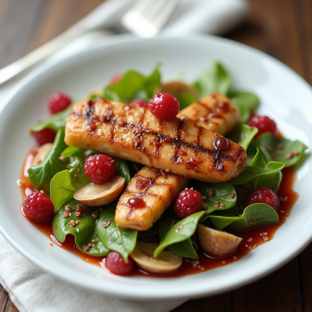 Une image irréelle d’une salade verte accompagnée de noix de Saint-Jacques, de filets de rougets et de pancetta grillée, accompagnée d’une vinaigrette à la framboise.