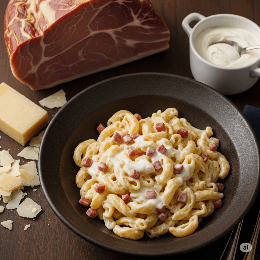 Les coquillettes sont généreusement enrobées d’une sauce onctueuse et crémeuse, ce qui suggère une texture gourmande. On voit clairement des morceaux de jambon coupé en dés, de couleur rosée, parsemés parmi les pâtes. Il semble que de la crème fraîche ait été ajoutée directement dans l’assiette, contribuant à la richesse du plat.