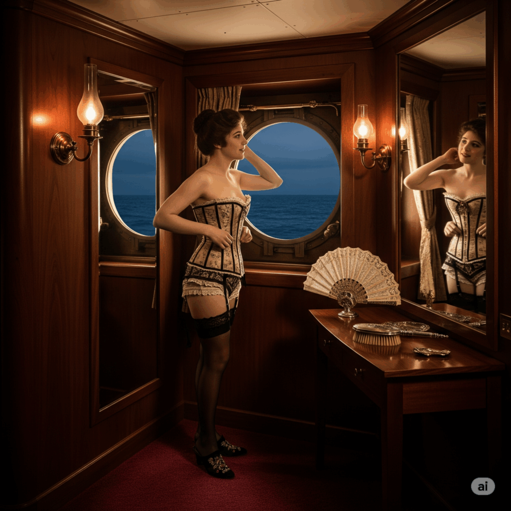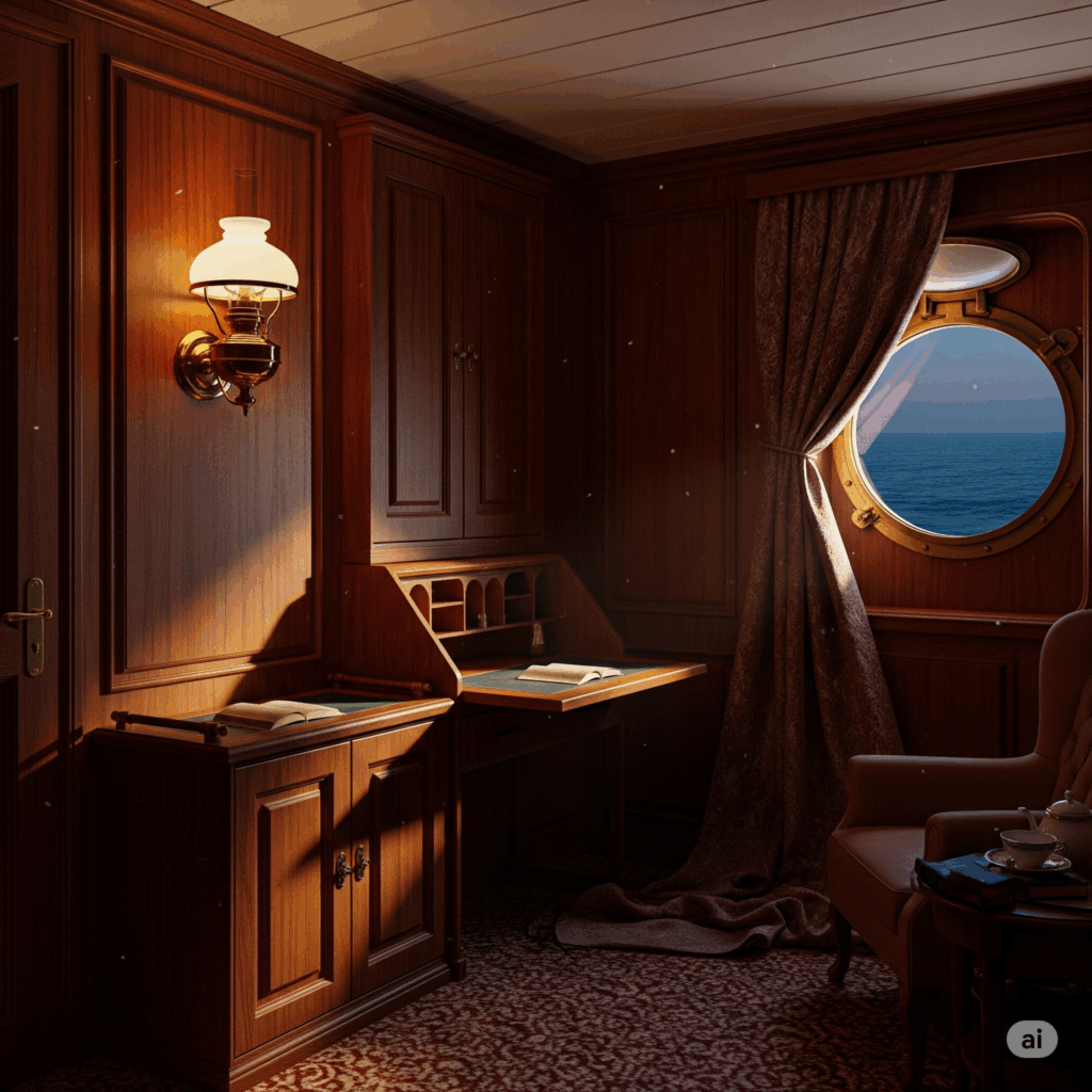 En 1900, à bord d’un luxueux transatlantique, une cabine de première classe avec des boiseries acajou, une moquette Bordeaux, un hublot laissant deviner la mer. Ambiance Clair-obscur une lampe à huile fixée au mur + lumière en soirée.