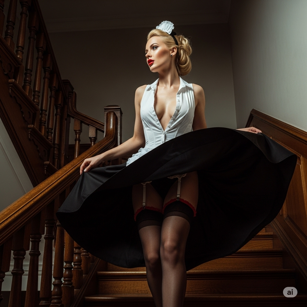 Dans un Manoir en 1890, une soubrette descend un escalier de service, blonde avec un chignon et une petite coiffe, des lèvres rouge vif et un maquillage sophistiqué , un corsage blanc entièrement déboutonné et très ouvert. Une jupe courte noir ouverte flottante sur ses bas fumés et ses jarretelles rouges, son corsage est très ouvert. L’image est en contre plongé vue de 3/4 depuis un palier. Ambiance clair obscure glamour et vintage.
