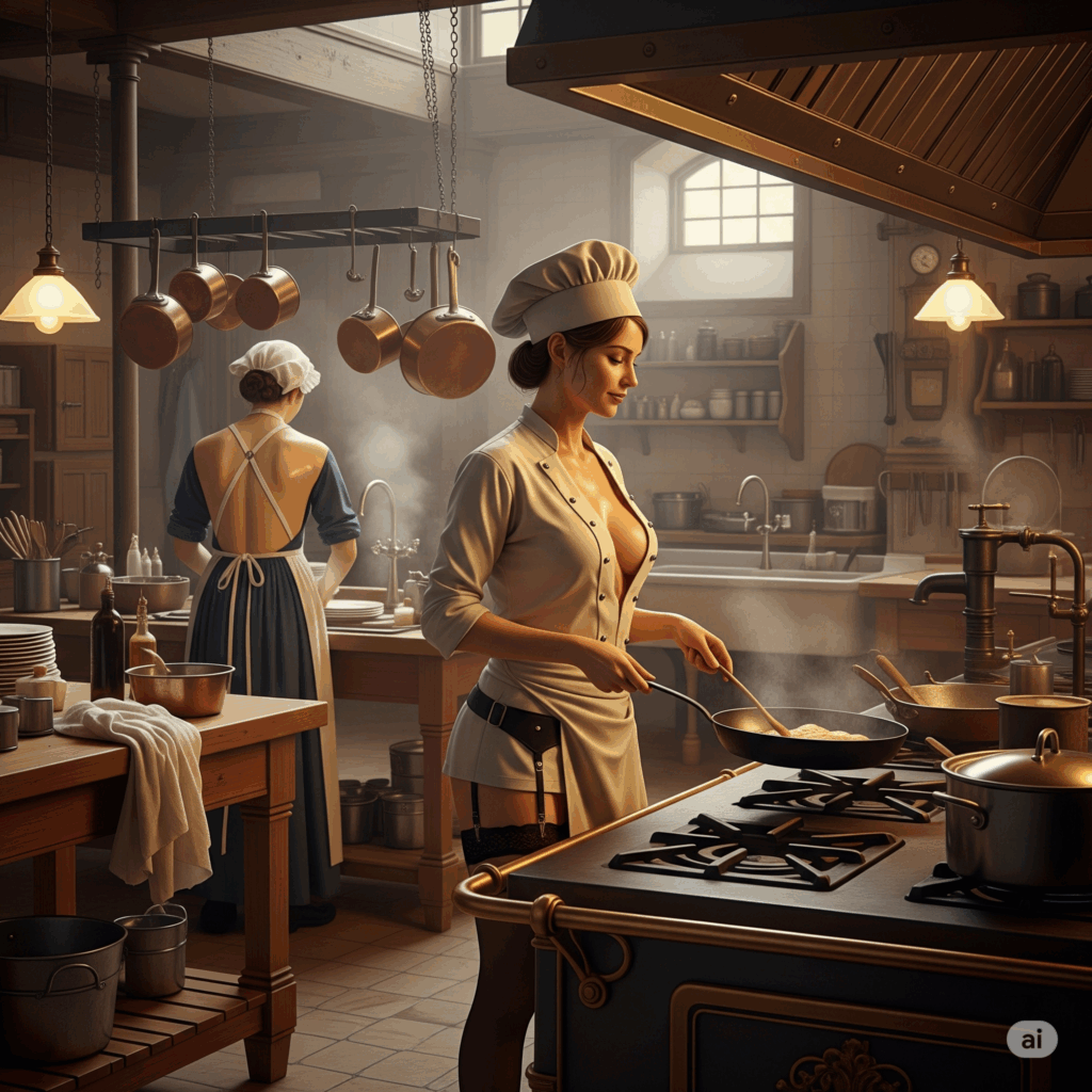 Photo d’une grande cuisine dans la cave d’une maison de maitre en 1900, avec fourneaux, tables et plonge. Il fait très chaud. Une servante au fond, de dos, sans rien sous son tablier bleu a bretelles fait la vaisselle, on voit son dos et ses bras humides. Au premier plan, une cuisinières mature élancée remue une poêle. Elle porte une veste de cuisine blanche déboutonnée sur sa poitrine généreuse transpirante, elle a des sabots et une toque de cuisine, un porte-jarretelles et des bas noirs. Elle regarde sa poêle la tète penchée en souriant. Ambiance glamour photoréaliste belle époque.