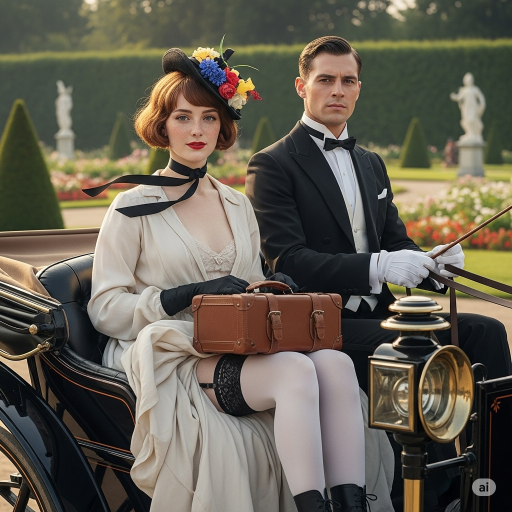 En 1900 Une femme et un homme dans un cabriolet tiré par un cheval. L’homme a droite de l’image costume de majordome belle époque. La femme une préceptrice auburn coupe au carré et rouge a lèvres, quelques taches de rousseur, une petite valise sur les genoux en robe de voyage soulevé par le vent montre des bas blanc et porte-jarretelles noire et des bottines noires. Son corsage est largement ouvert. Elle porte un collier de tissus noir et un chapeau fleuri. Ambiance parc de château, glamour. Close up de 3/4 depuis la porte du personnel.