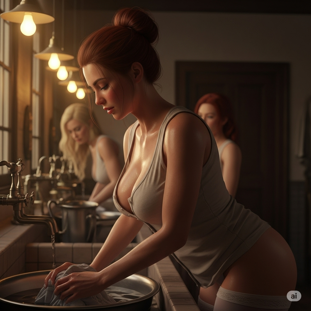 A la belle époque 1900. Une buanderie dans une maison de maitre, chauffée par la vapeur des machines, avec des étendages de linge, des bacs de lessive et une lumière tamisée filtrant à travers la buanderie. L’atmosphère est humide, presque étouffante, avec des reflets de lumière sur les surfaces mouillées. Une femme élancée, un chignon auburn. Elles est vêtue légèrement à cause de la chaleur un débardeur très court ouvert, très décolletée et non boutonnée sur sa grosse poitrine et des bas blanc. Son visage est rosé par la température ambiante, une fine pellicule de sueur sur sa peau. Penchée en avant, elle lave du linge dans un bac Il fait presque nuit et les ampoules diffusent un maigre éclairage sur sa peau. Deux autres femmes blonde et rousse très peu vêtues sont en arrière plan. Ambiance glamour, clair obscure et chaleureuse.