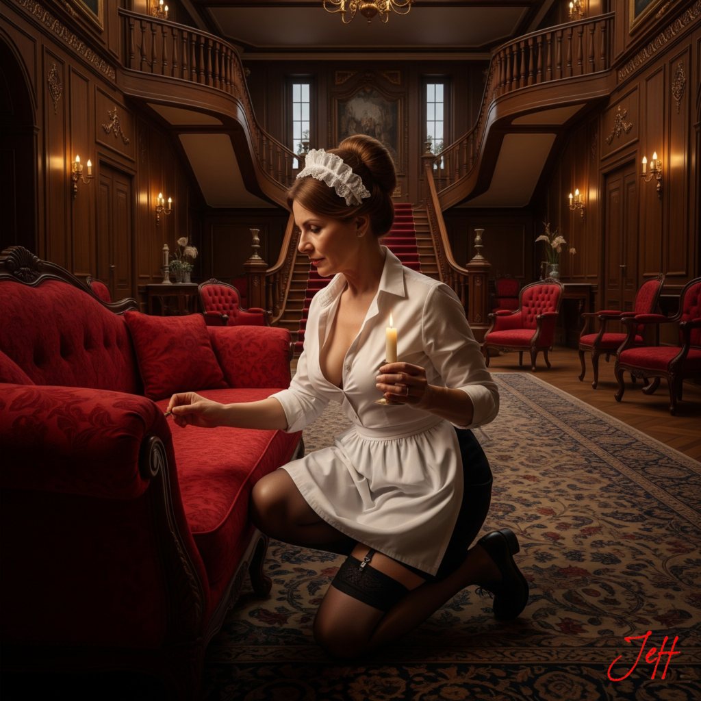 Un hall d’entrée belle époque immense, Des canapés, des fauteuils et chaises, ambiance chaude et clair obscure. Un escalier double en arrière plan. Une femme de chambre mature, élancée, auburn cheveux en chignon avec une coiffe, une chemise entièrement déboutonnée et un tablier, des jarretelles et des bas noirs, accroupie une chandelle a la main vérifie un canapé. Ambiance chaude, clair obscure.